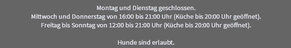Mittwoch und Donnerstag von 16:00 bis 21:00 Uhr (Küche bis 20:00 Uhr geöffnet).